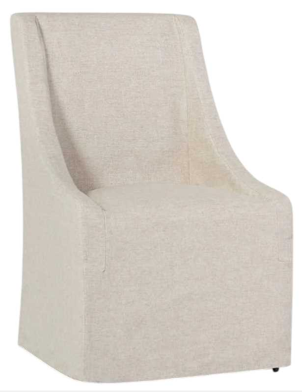 This classic dining chair elegantly marries form and function with its sloping arms, adding a graceful curve that comfortably cradles the body. Equipped with castors for effortless mobility around your dining table, its neutral oatmeal upholstery effortlessly complements any color palette, enriching your dining experience.Read More