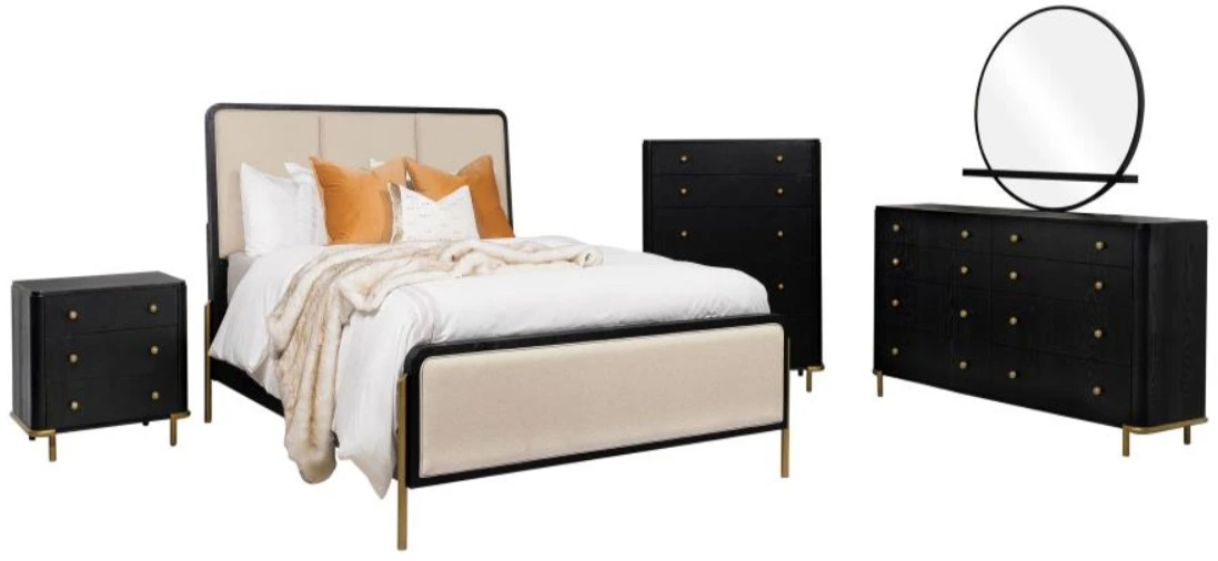 Includes: One (1) California king bed, one (1) nightstand, one (1) dresser, one (1) dresser mirror, and one (1) chest