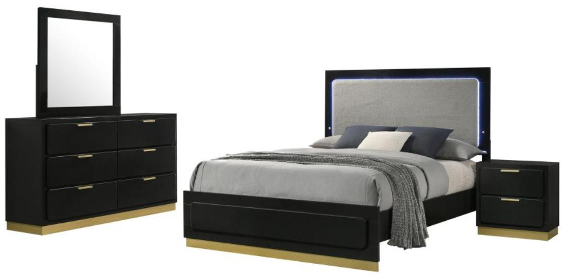 Upholstered headboard with touch LED lighting highlights a four-piece bedroom set