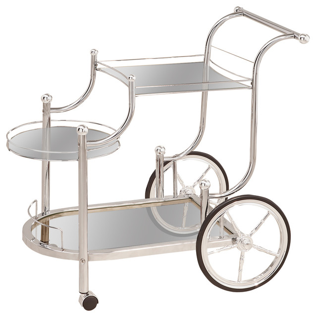 Graceful curves create a compelling fluid silhouette on a cart made from metal with finishes in distressed white and chrome. Two tempered glass shelves hold beverages and implements.