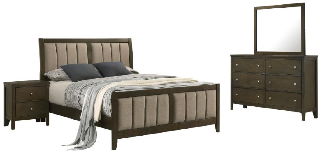 Includes: One (1) California king bed, one (1) nightstand, one (1) dresser, and one (1) dresser mirror