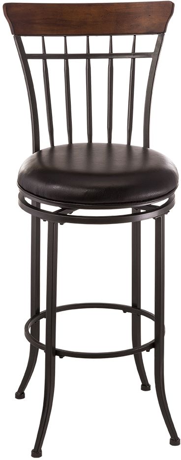The Cameron spindle back swivel stool features vertical spindles and a wood panel at top of for added interest. Finished in Chestnut Brown and grey, this stool is handsome alone or paired with the other items in the Cameron collection.