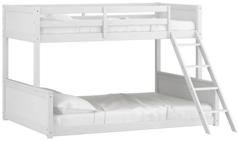 Stylish twin over full white wood bunk bed with shiplap design