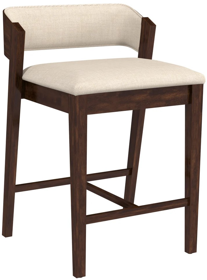 The framework of this counter height stool is sleek and styled for comfort. The upholstered back and seat boast a light beige fabric accented by a distressed brown finished wood frame. The wood extends around the low-profile back, which is set at a comfortable and attractive angle, further accentuating the stool’s midcentury modern appeal.Read More