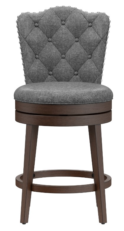 A triple-arched design creates a scalloped edge on the full back, and tailored welting around the double ring base adds to the graceful presentation. Both the rounded seat and back are upholstered in a smoke gray, and the tapered legs of the sturdy wood base are finished in a warm chocolate. With a 360-degree swivel seat and carefully placed footrest, this stool is as practical as it is stunning. Assembly required.