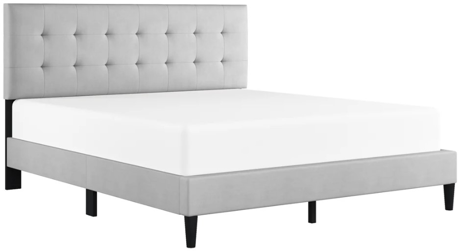 Crafted with a wooden frame, this queen bed's headboard, footboard, and side rails are all fully upholstered in a neutral fog gray upholstery for a clean aesthetic. A slat system means no box spring required. Queen mattress required, not included. Assembly required.