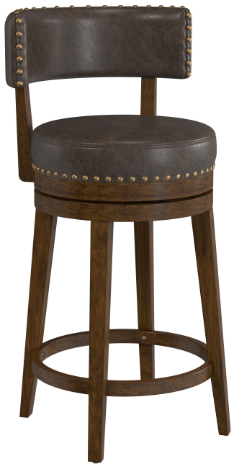 Stylishly crafted, the base of this traditional stool is made from a durable wood in a rich walnut finish that sturdily supports a 360-degree swivel seat upholstered in an aged brown faux leather with antique gold nail head trim two design details that meet again at the barrel-style back that offers the perfect place to lean back and relax.