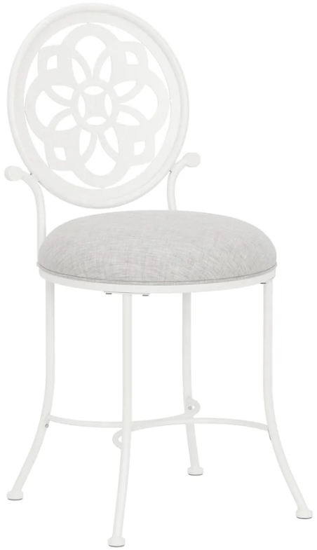 The stunning backrest on this traditional vanity stool blurs the line between art and utility. The intricate geometric design acts as the focal point, sitting between two gracefully arched posts. The four curved legs add to the elegant silhouette, and the seat is upholstered in a white fabric, completing this classic look.Read More