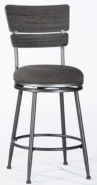 The Hillsdale Furniture Melange Wood Back Counter Height Stool is influenced by Midcentury modern style. Its base is made from heavy gauge Charcoal Gray tubular steel. The contoured back features a Dark Gray Wirebrush wood finish; and the seat is upholstered in a silky soft Charcoal Gray faux suede. This counter-height stool has 360° swivel functionality and perfectly placed footrests for extra comfort. Ideal at your counter-height dining table or kitchen island.