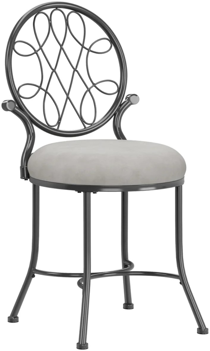 This gray metal vanity stool features a tall back with Celtic knot work, framed in a strong steel circular chairback and complimented by arched stretchers and flared legs for a true traditional look. A padded seat in light gray 100% upholstery keeps you supported, while the metallic gray finish keeps it cool.Read More