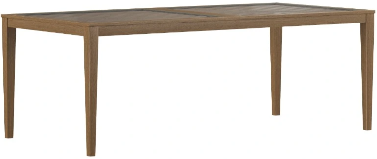 Table frame is wooden construction in a light brown finish; Tabletop inlay frame is metal construction in a brushed bronze finish; Tabletop is glass