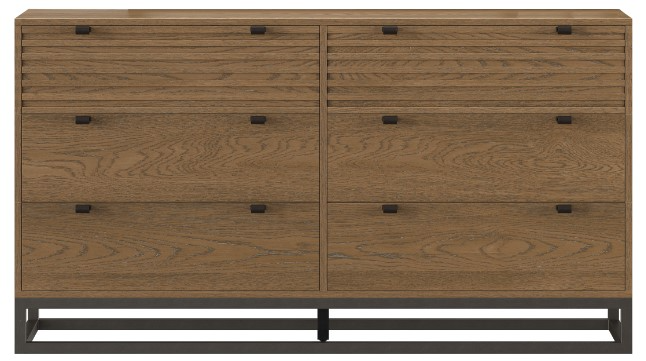 This six-drawer dresser boasts clean lines and a sleek mixed-media design. The wooden top features a vibrant, textured wood grain that peeks through a light brown finish, while the heavy-gauge metal base is finished in a burnished black.Read More