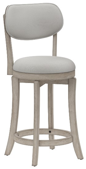 Its legs arch gracefully outward in the cabriole style, and the contour of the back is welted for an effortless, tailored look. The back and rounded seat are padded for maximum comfort and upholstered in a neutral fog shade, and the aged gray finish on the solid wood frame adds dimension. With a 360-degree swivel seat and carefully placed footrest, this stool will be right at home in your kitchen or casual dining area.
