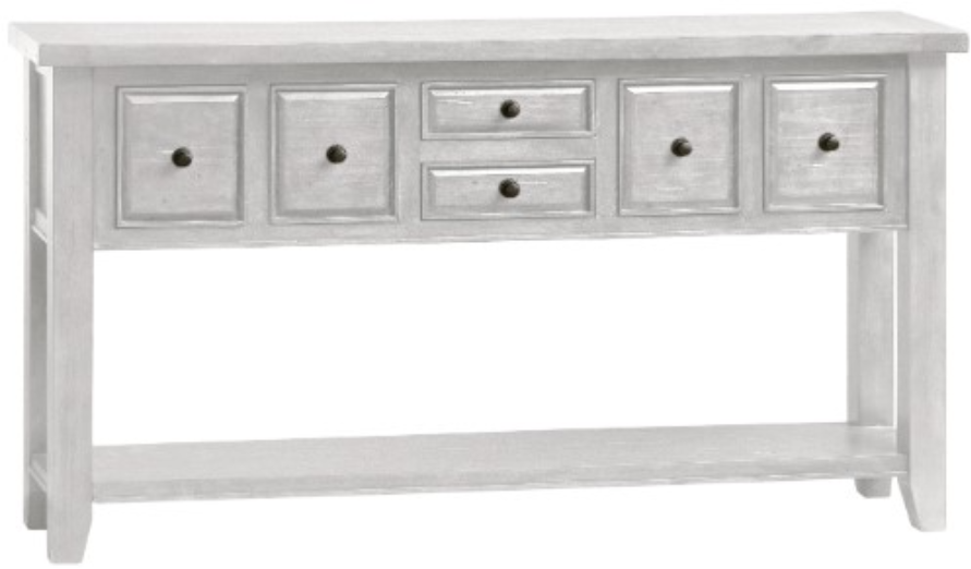 Coastal farmhouse 6-drawer hall table offers a combination of open and concealed storage in a sea white finish