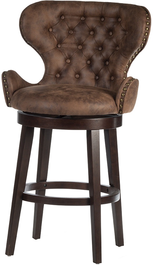 The Mid-City bar height stool has a sophisticated dramatic style. The bar stool makes a statement with it's oversized seating and curved wing back arm design making it perfect for any decor. The refined smoke chocolate finished wood base has tapered legs and features a 360 degree swivel seat. Pairing a chestnut colored faux leather upholstery with matte gold nail head trim detailing, this bar height wood stool brings modern contemporary flair to your entertainment or kitchen area. Assembly required.