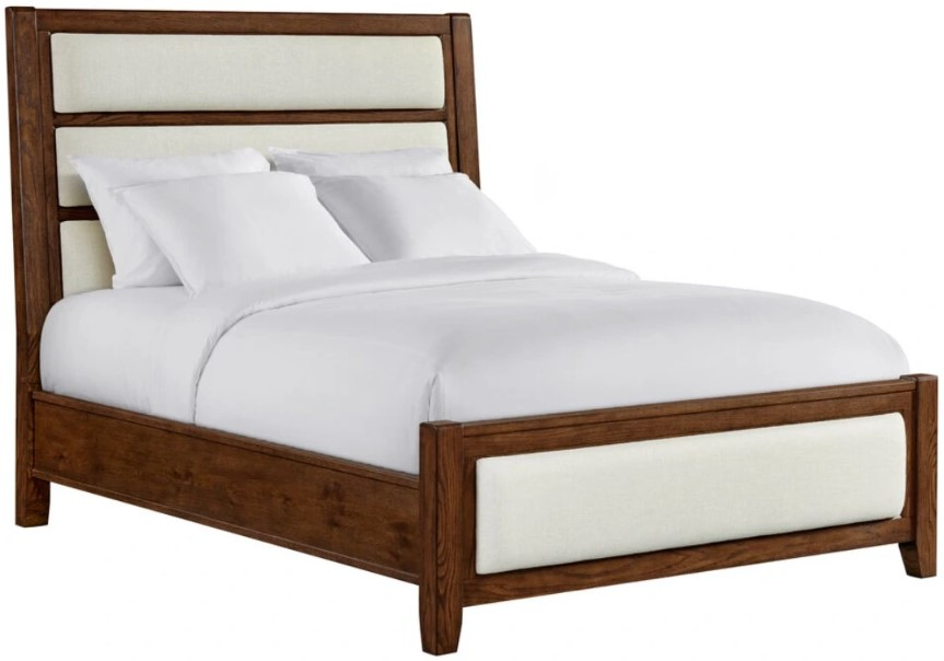 Uniquely upholstered headboard and footboard on the beds are offered in King and Queen sizes and come in standard or storage side rail options. The unique hardware used throughout this collection comes in a rich brushed gold finish which perfectly magnifies the warm tones seen throughout the sable brown finish.