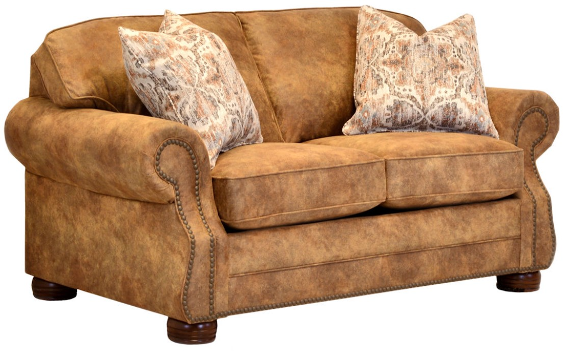The style boasts a rolled arm with a semi-attached camel back, grooved wood bun foot and natural nail head trim and is also available with brass, silver, pewter, natural or shot gun nail head trim. This style includes a sofa, love seat, chair, ottoman and queen sleeper and is also available in leather (L633).