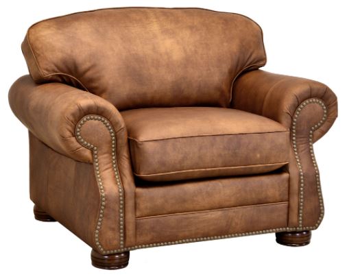 The style boasts a rolled arm with a semi-attached camel back, grooved wood bun foot and natural nail head trim and is also available with brass, silver, pewter, natural or shot gun nail head trim. This style includes a sofa, love seat, chair, ottoman and queen sleeper and is also available in leather (L633).