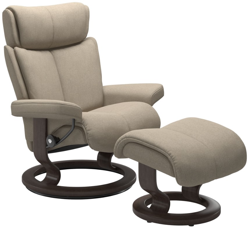 The Stressless® Magic medium manual recliner and ottoman with classic base is expertly designed for absolute comfort. With ultra-soft cushioning, an enveloping seat and back, and an adjustable neckrest, it delivers full-body support. Its sleek, customizable design pairs premium materials with the brand’s signature ergonomic innovation.Read More