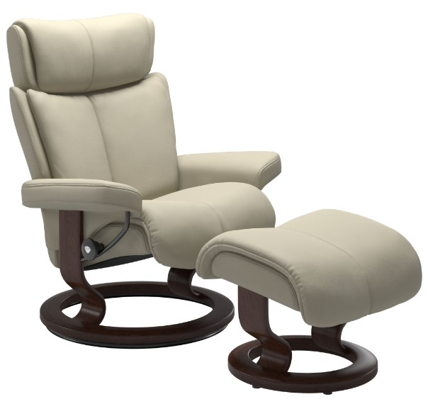 The Stressless® Magic Manual Recliner and Ottoman with Classic Base is crafted for ultimate softness and ergonomic luxury. Its enveloping seat and contoured back provide exceptional full-body support, with an adjustable neckrest for added comfort. Manual recline via Glide™, paired with customizable leather and wood finishes, completes the experience.Read More