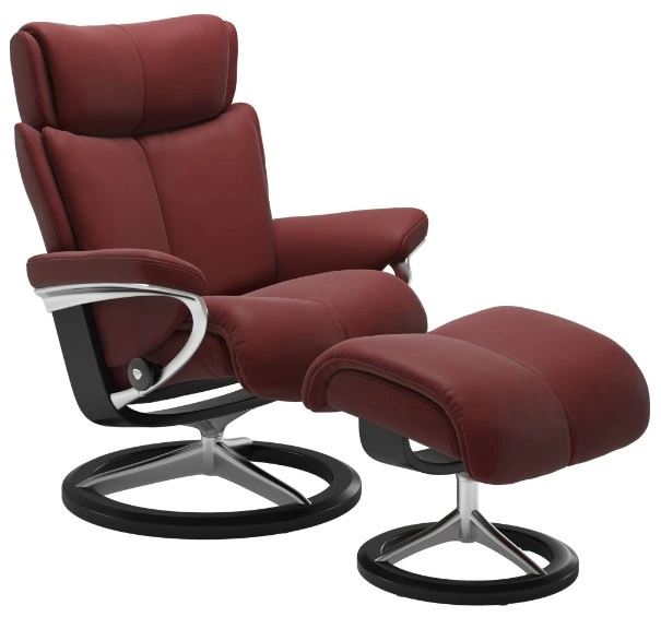 The Stressless® Magic manual recliner and ottoman with signature base offers unmatched comfort with plush cushioning and ergonomic support. Its contoured design cradles the body, while the adjustable neckrest and BalanceAdapt™ system enhance relaxation. Finished with customizable leather and wood options, it blends luxury, motion, and timeless Scandinavian design.Read More